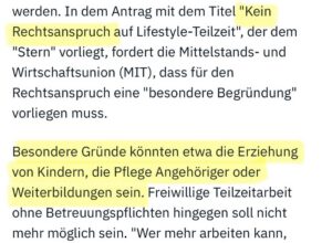 Tatsächlich fordert der Wirtschaftsflügel der CDU, die Mittelstands- und Wirtschaftsunion (MIT), nicht die generelle Abschaffung von Teilzeitarbeit, sondern eine Einschränkung des pauschalen Rechtsanspruchs. Der Anspruch soll künftig nur dann bestehen, wenn eine besondere Begründung vorliegt, etwa bei der Betreuung von Kindern, der Pflege von Angehörigen oder zur beruflichen Weiterbildung.