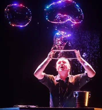 Als Produzent und Gastgeber der Varieteereihe Varietespektakel (Koeln/Bonn) weiß er, wie man Abende dramaturgisch baut, Spannung hält und Menschen miteinander verbindet. Genau diese Erfahrung fließt in seine Seifenblasenkunst ein: Jede Nummer ist mehr als ein Effekt – sie ist eine Szene, ein Charakter, ein Moment, der im Raum „erzählt“.